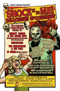 CALLING ALL COOL GHOULS! Haunting the historic Café Du Nord on October 31st, the SHOCK-IT-TO-ME! HALLOWEEN SPOOKENANNY will, claws down, be the most insidious show in San Francisco this Ghoultide Season! Bringing back a real sense of old skool All-Hallows-Eve fun, event promoter August Ragone (columnist for "Famous Monsters of Filmland" magazine), has sewn together a monstrous fright night of horror hosts, maniacal music, creepy contests, and more tricks ‘n treats than you can shake a bloody stake at!