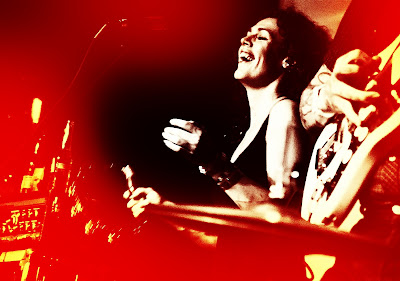 As King Khan & the Shrines were setting up, I wondered how they were going to fit all those band members on the tiny stage -- there's a whole lot o' Shrines. And then...SLAMMO! Like the running of the bulls, the band and the crowd exploded into instant frenzy and chaos, people tumbling into each other while the magnificently-feathered and bespangled King shouted like he was presiding over a sweaty, take-no-prisoners soul review of days past. SMASH! Guitarist Mr. Speedfinger meant business, dangerously balancing a black-shod foot at the edge of the stage where Suzi and I stood, sending the glass bottles, plastic cups, and beer cans that had been sitting there flying. Most of the set Suzi and I were avoiding decapitation from his guitar headstock which swung violently a foot or so over our heads, although admittedly, that would have been be a cool way to go.